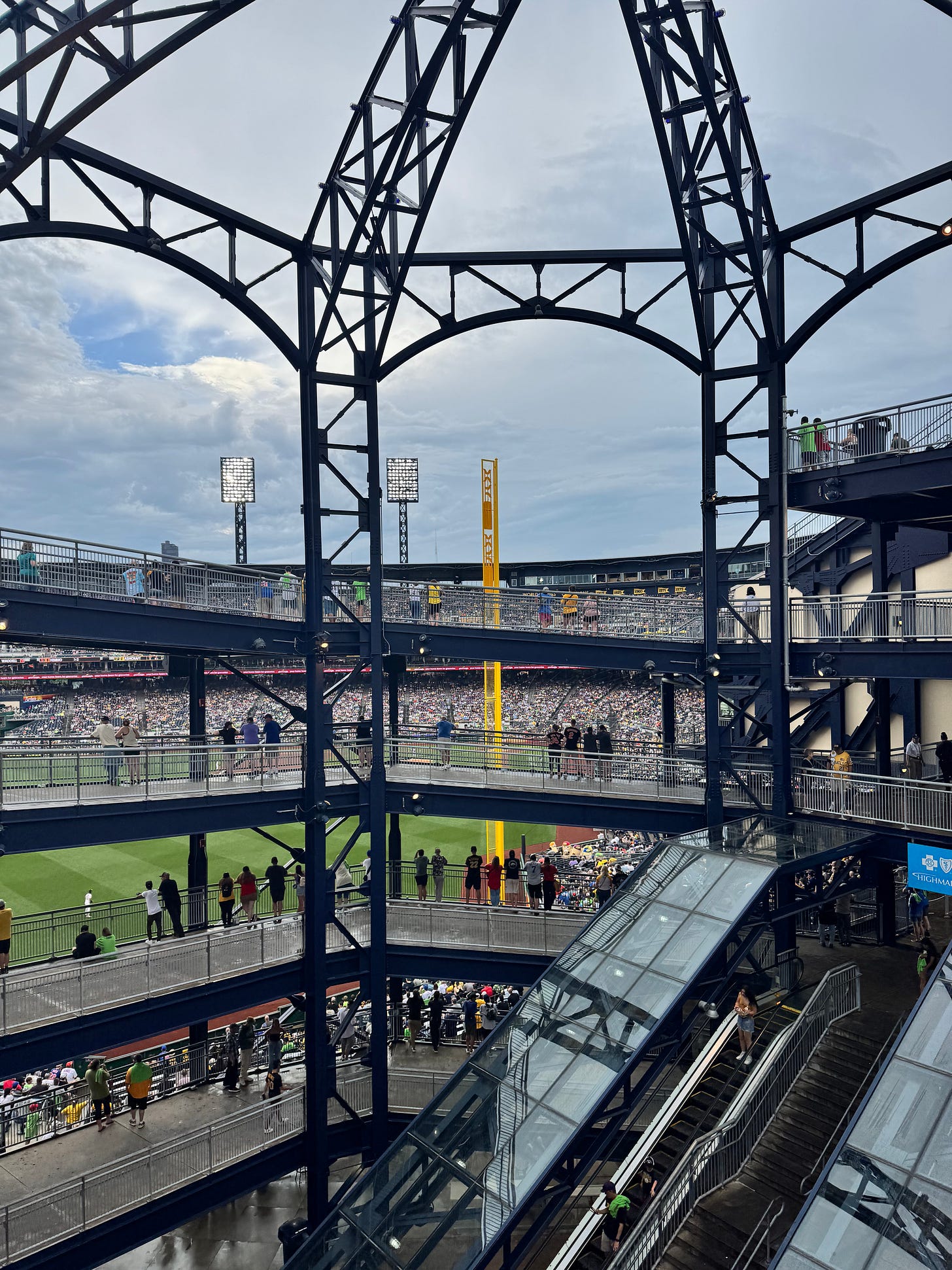 The photos do not do this justice. The Rotunda is a spiral ramp that is over the left field wall. However, unlike most spiral ramps in sports, it’s completely open air. It has the elements of the park: Steel beams. Higher levels offering shade for the lower levels. For me though, walking this put me in a time machine to a bygone time in baseball history that didn’t officially exist. Leaning up against the railing and watching the game allowed those who get overstimulated at games a chance to wind down. And since security wasn’t barking at you to move out of the way, it lent itself to being almost like a neighborhood hangout out there. “Hey, bud. Wanna get hot dogs, chill, and watch the game over the fence?”