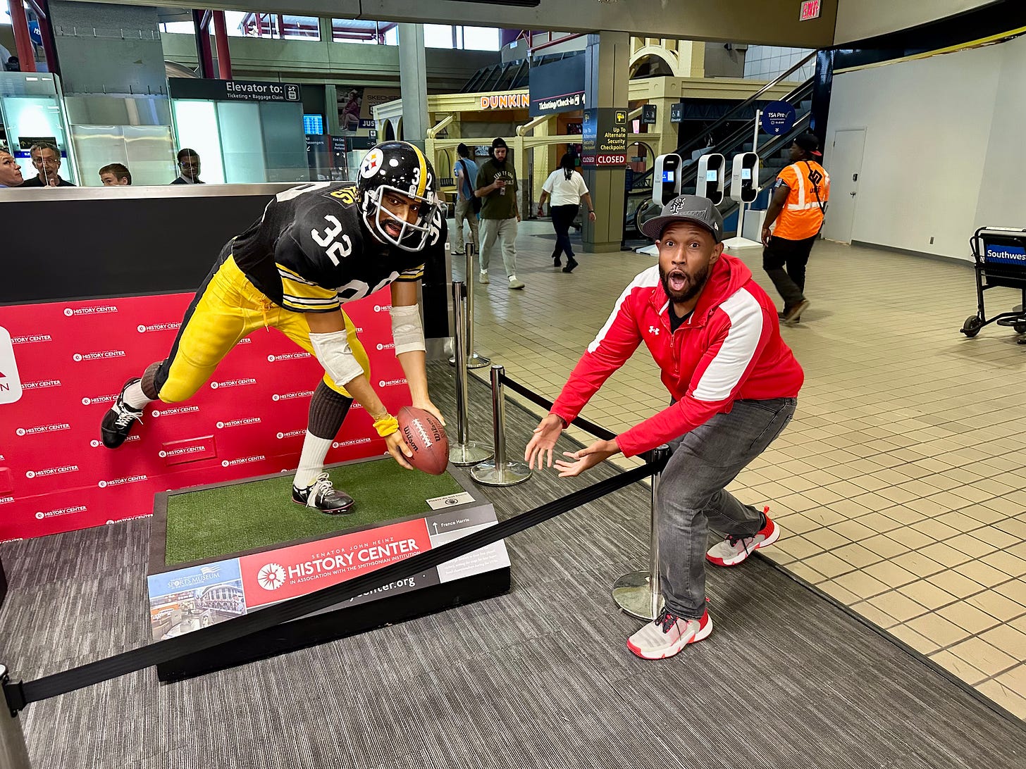Pittsburgh itself is kind of a trip. A town that proudly made its whole brand “blue collar gritty” before it was cool, ‘Steel City’ is a town that has a small-town feel with a big-city downtown that overlooks the Allegheny River. US Steel calls it home, most of the sports teams use black and yellow as their colors, and because of that, a particular Wiz Khalifa song gets played all the time. I was looking forward to take a weekend out there, though. And when a friend of mine told me I needed to pose by the “Immaculate Reception” statue at the airport, I went full tourist mode.
